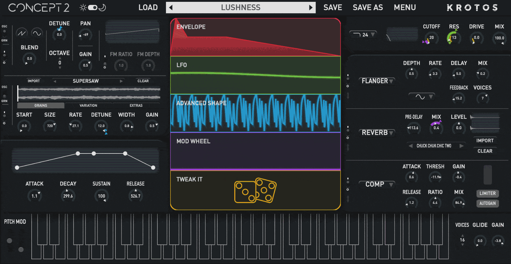 Responding to user feedback, a new Advanced Shape modulator has been added to Concept 2. This goes way beyond traditional LFOs and Envelopes, allowing you to design your own shapes with custom breakpoints and curves, to be used as an LFO or envelope to control any parameter in the plugin. Concept 2’s modulation system is semi-modular and you can combine the multiple instances of Advanced Shape with any other collection of modulators for one of the simplest, most powerful modulation workflows in the synth world.