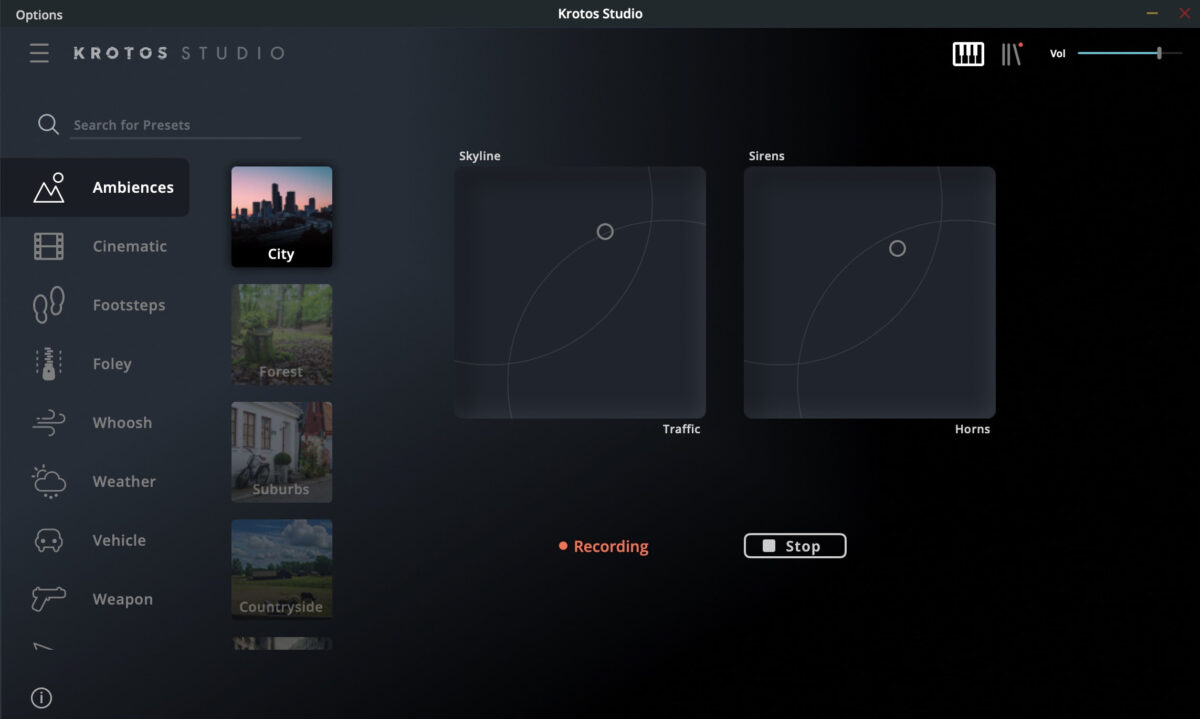 Krotos Studio is a standalone desktop application. To create traffic sound with it, open the app and head to the city preset which comes with the free version of Krotos Studio
