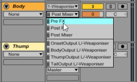 Simply add Weaponiser to a midi track. Create four new audio tracks, and rename then to receive the audio from each engine (e.g. Onset, Body, Thump, Tail).